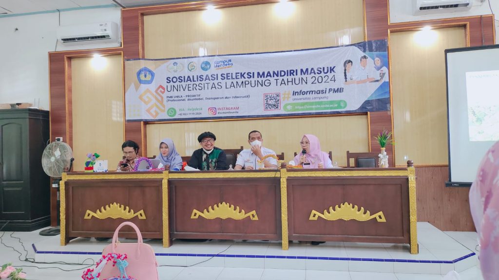 Hari ini, Kamis, 6 Juni 2024, SMA Negeri 1 Kotabumi menerima kunjungan dari tim Penerimaan Mahasiswa Baru (PMB) Universitas Negeri Lampung (Unila) dalam rangka sosialisasi penerimaan mahasiswa baru Tahun 2024. Kegiatan yang dilaksanakan di aula SMA Negeri 1 Kotabumi ini dihadiri oleh tim PMB Unila yang terdiri dari Dr. Ir. Nandi Haerudin, M.Si, Ubaidah, S.T, M.T, Rahman Taufik, S.Pd, M.Kom, dan Dina Melia Putri, SE.